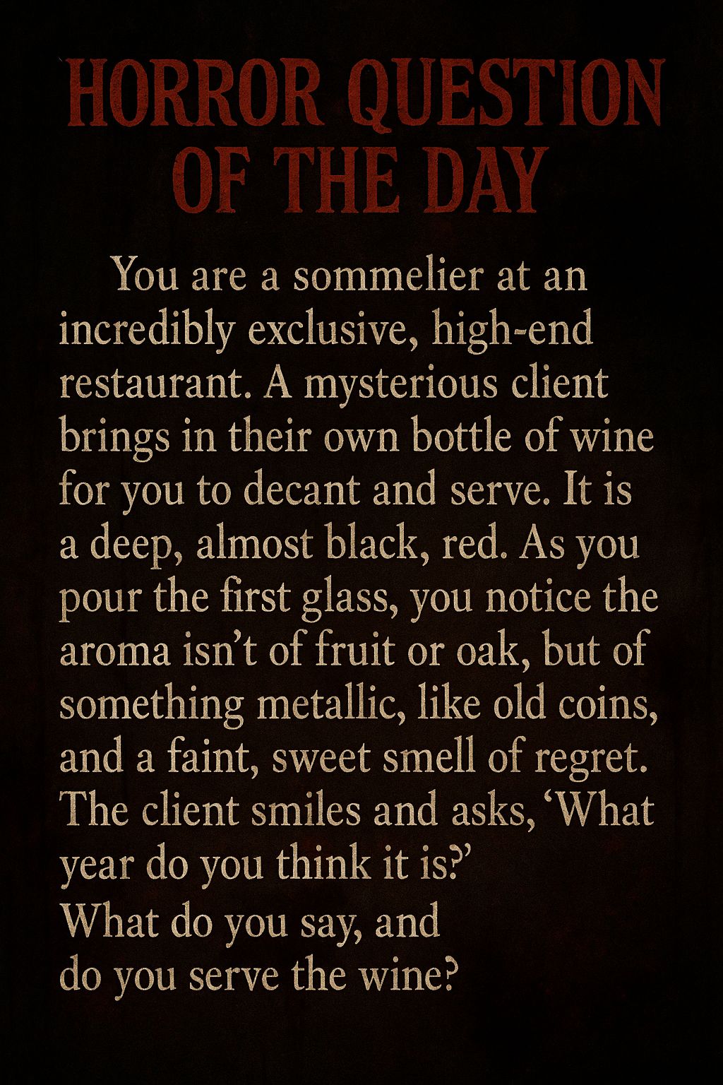 “Mam, I am confident that this is an 1788 vintage. There’s blood in this, but it’s been transformed—fermented into something exquisite. It is a very delicious wine.” As I poured her a glass, she smiled, her fangs began to show.